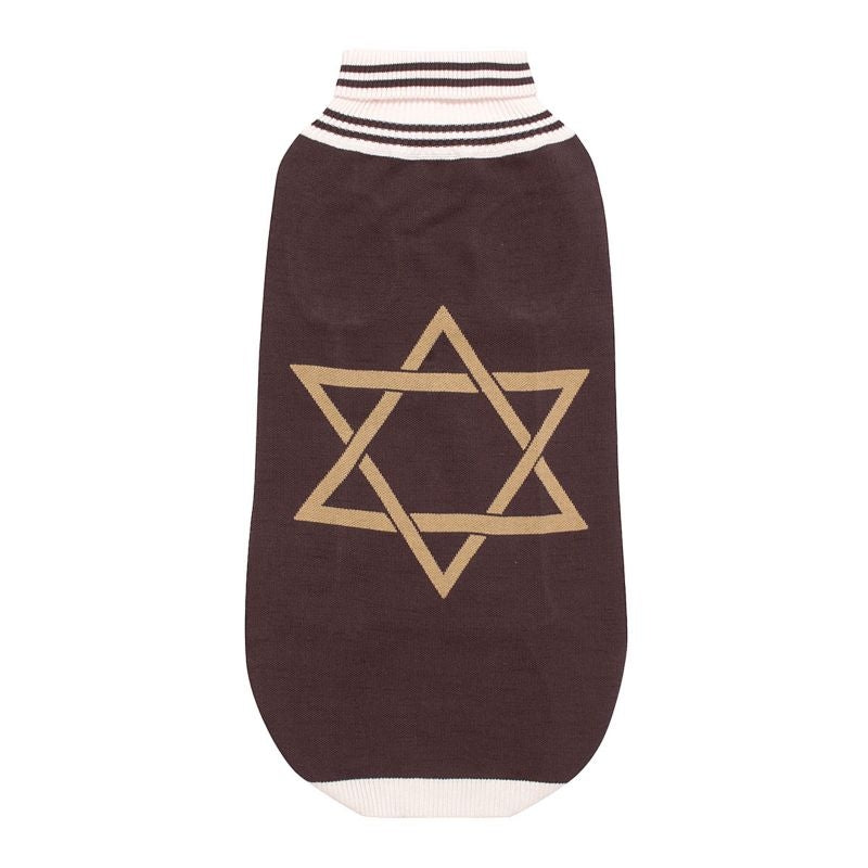 Your pooch can celebrate Chanukah with its own Halo Star of David sweater!. Pullover style allows for easy on/off with front leg holes. This adorable sweater combines comfort and warmth and makes a perfect holiday gift for your pup. This style comes with a gold star on a charcoal background. Sizes XXS to XXXL