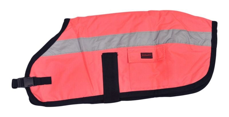 Made from waterproof hard wearing fabric, excellent for dogs running through high grass or bushes. Lined in a quilted poly cotton. 2 reflective tape at the sides. Large collar with leash hole can be turned up against wind & rain or folded back in nicer weather. Full wrap touch tape belly closure keeps your dog dry and warm. Hi-Vis color and reflective piping is perfect for hiking, hunting season, or walking at night.Fully washable on a warm wash.DO NOT put in the dryer due to the reflective tape.
