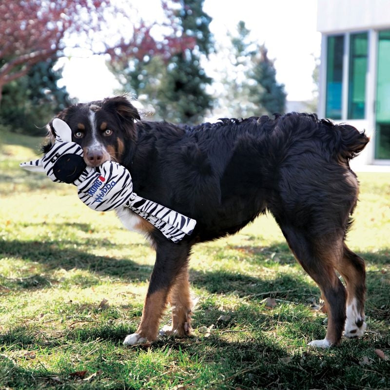 The KONG Wubba No Stuff Large Dog Toy will provide hours of fun.  It is perfect for those dogs that are wild about fetching and tugging fun.  The long tails are ideal for natural thrashing.  There is no stuffing and a flat shape so it is designed for chewing satisfaction.  The squeaker adds to the enjoyment making play sessions last even longer.