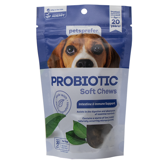 INGREDIENTS: Potato Starch, Natural Pork Flavor, Cane Molasses, Canola Oil, Glycerin, Dried Potato, Inulin, Dried Bacillus Subtilis Fermentation Product, Dried Bacillus Licheniformis Fermentation Product, Dried Enterococcus Faecium Fermentation Product, Dried Lactobacillus Casei Fermentation Product, Dried Lactobacillus Plantarum Fermentation Product, Dried Lactobacillus Acidophilus Fermentation Product, Sunflower Lecithin, Lactic Acid, Sorbic Acid (Preservative), d-Alpha Tocopheryl Acetate (Natural Vitamin E), Chitosan, Egg Protein, Turmeric