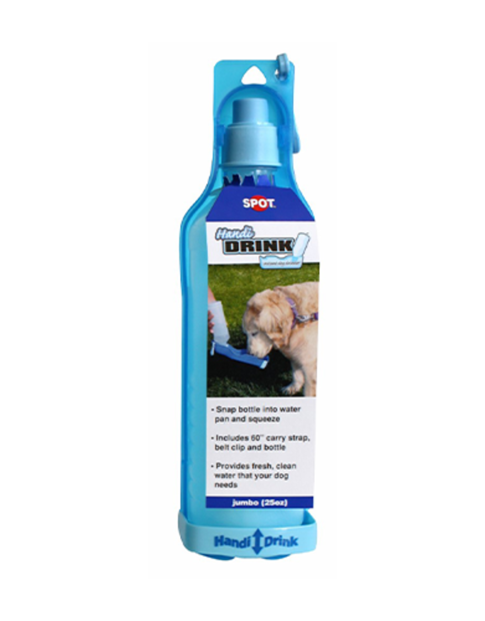 Ideal for all walks, hikes, travel, bike, vacations, camping and events! Just fill the Handi-Drink water bottle with fresh water. When your dog needs a good drink or a quick gulp, just snap the bottle into the water dish, squeeze the water bottle, and let your dog lap up the fresh running stream of water. Instant hand-held convenience. No hassles, spills, or wasted water.