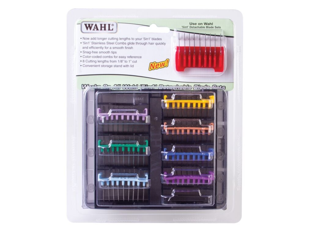 The Wahl Stainless Steel Clipper Guide Combs Set is a necessity for all your grooming needs.  The convenient professional attachment guide combs are the perfect accessory for grooming pet and coats of all types.  The stainless steel technology allows cobs to glide through coats quickly and efficiently leaving a smooth finish and will not leave track marks.  Each comb has smooth tips for snag free grooming and are conveniently colored coded for easy reference.  Each securely fits all 4 sides of the blade eliminating comb detachment or gouge mistakes.