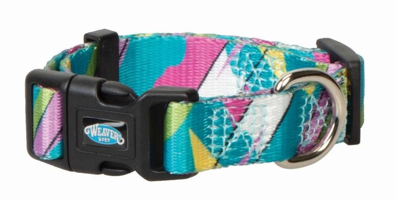 Fun, on-trend patterns take these comfortable, single-ply webbing collars to the next level. Adjustable design fits a wide range of sizes and features a black plastic slide, keeper and contoured quick-release buckle for easy fastening. With box-stitching at stress points and a nickel-plated dee for easy leash attachment, this collar will quickly become one of your favorites.